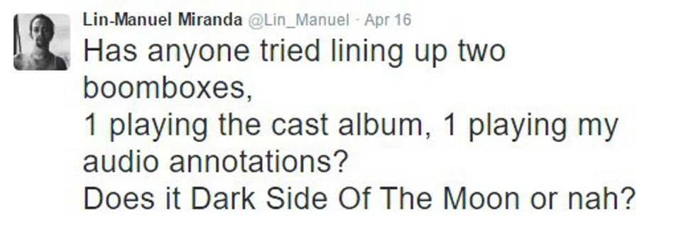 He took to Twitter to find out if any fans figured out if the cast recording of "Hamilton" and his audio comments lined up like Pink Floyd's "The Dark Side of the Moon" lined up with "The Wizard of Oz." He also asked if fans figured it out using boomboxes, instead of, you know, iPhones or some technology like that.
