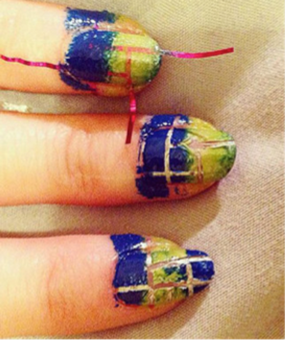 In this photograph, we see the common mistake made with trying to create plaid nails, which is using too much color that it overlaps all of the other colors and turns it into a gushy mess of paint and sadness.