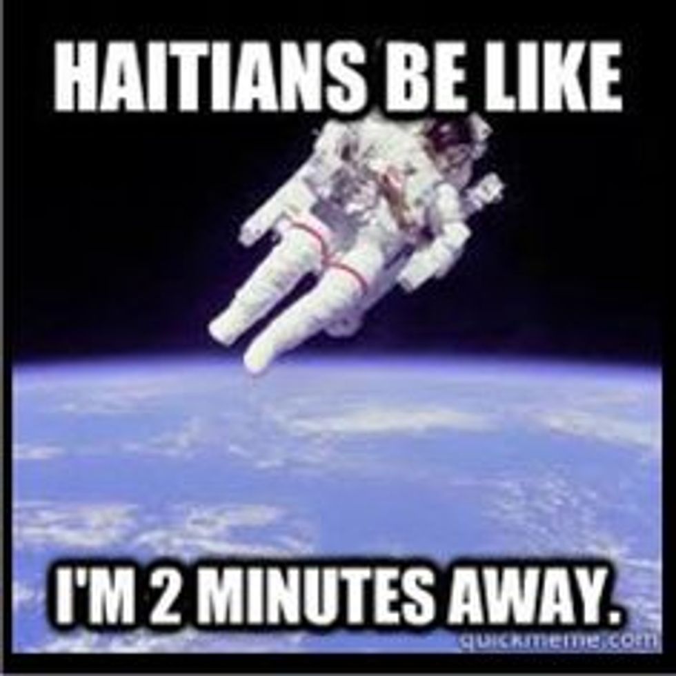 Let's say a party starts at 7 o'clock. You have to tell your fellow Haitians that it starts at 5 so they MIGHT actually have a chance of coming on time. *Whispers* which probably isn't likely.