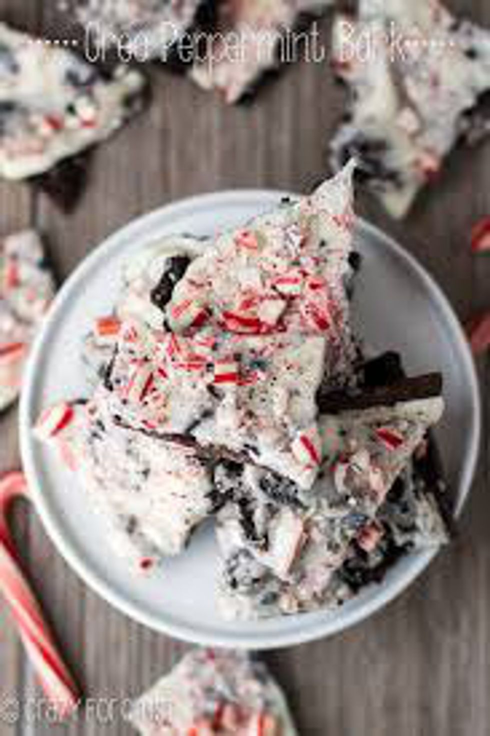6. Take the tin out of the freezer. Pour the white chocolate over the crushed Oreos and spread evenly. Sprinkle the crushed candy canes on top. Optional: crush Peppermint patties and sprinkle them on top of the white chocolate with the candy canes for a mintier flavor.