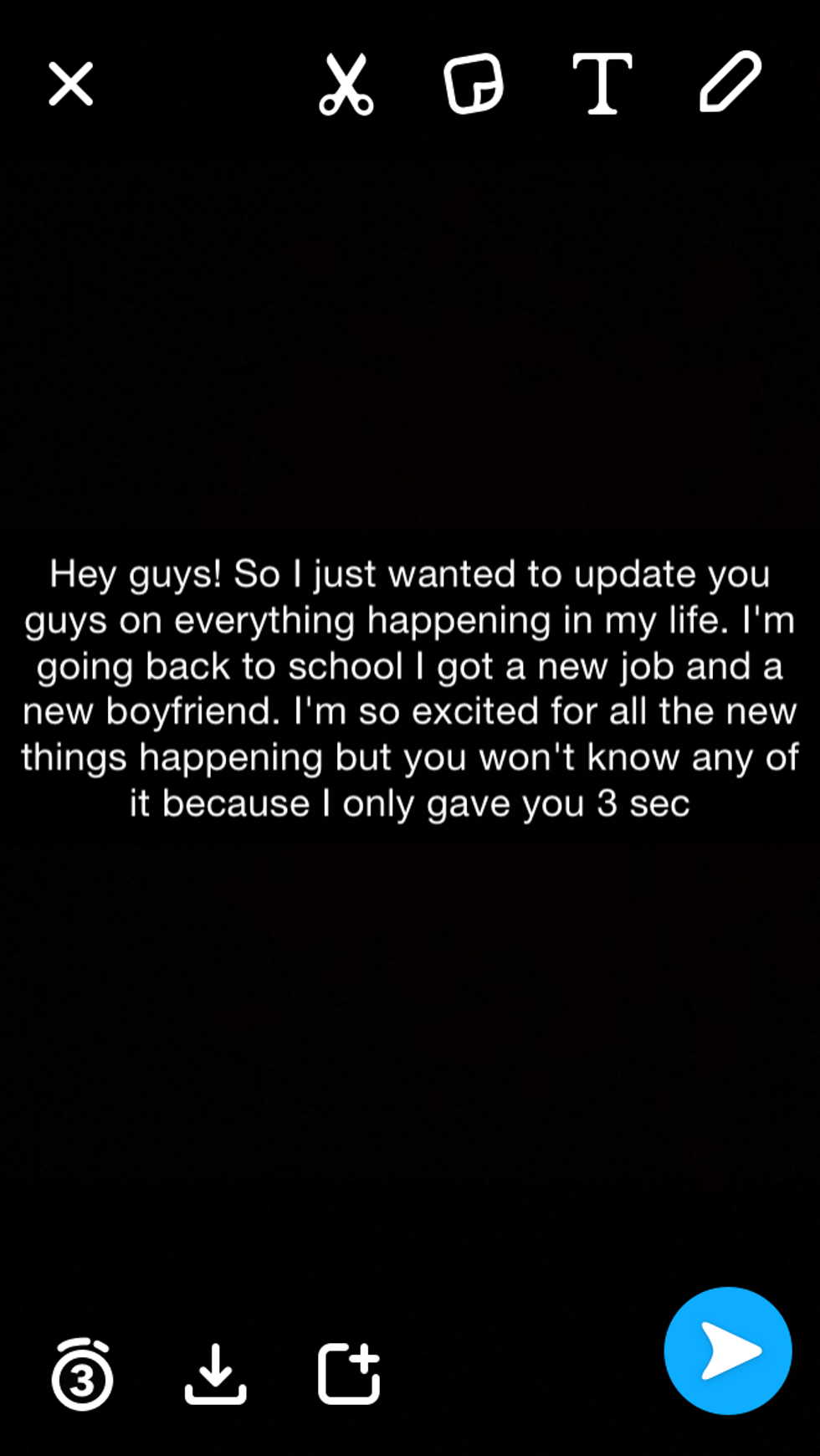 For the love of everything good and holy, please check the little timer on the bottom-left of the screen before you post a photo onto your story. I like you. I want to hear what you have to say. I want to read what you wrote, but if you type more than two lines worth of text and only put three seconds on the timer, I promise you I didn't read more than the first line. Sometimes, I will go back and screenshot the snap if I am really interested in what my friend had to say, but a good rule of thumb is to always check your timer so you don't annoy your viewers.