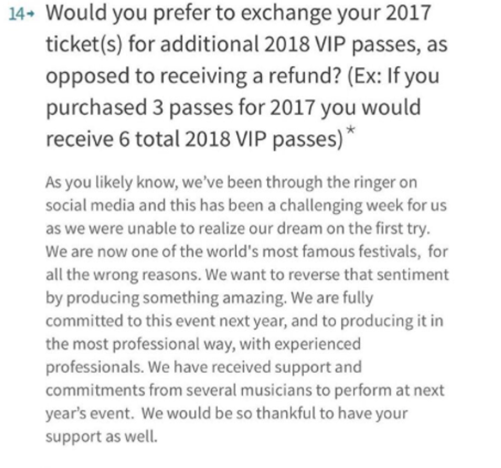 Instead of getting a full refund, they are trying to convince people to exchange their 2017 tickets for tickets to the Fyre Festival next year. So, instead of getting the money back, you can hold out hope that they might get it right next year. Unbelievable.
