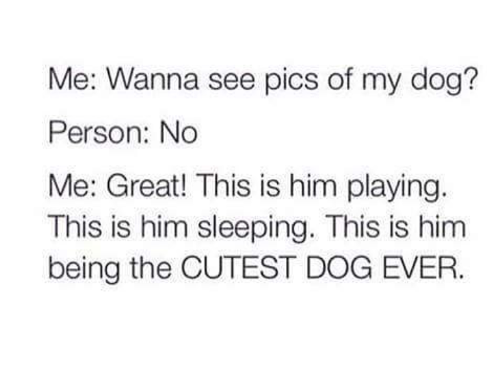 I am constantly keeping my friends, family and basically anyone I meet, up to date on how my dogs are doing. My dog turned one and it's a big deal, so I will let all of my Facebook friends know about it. My dog got a new sweater, so obviously I'm going to post a picture of him in it. My dogs snuggle together in their bed and I can't stand it, so I'm going to let everyone know because I can and I want to show them off to the world.