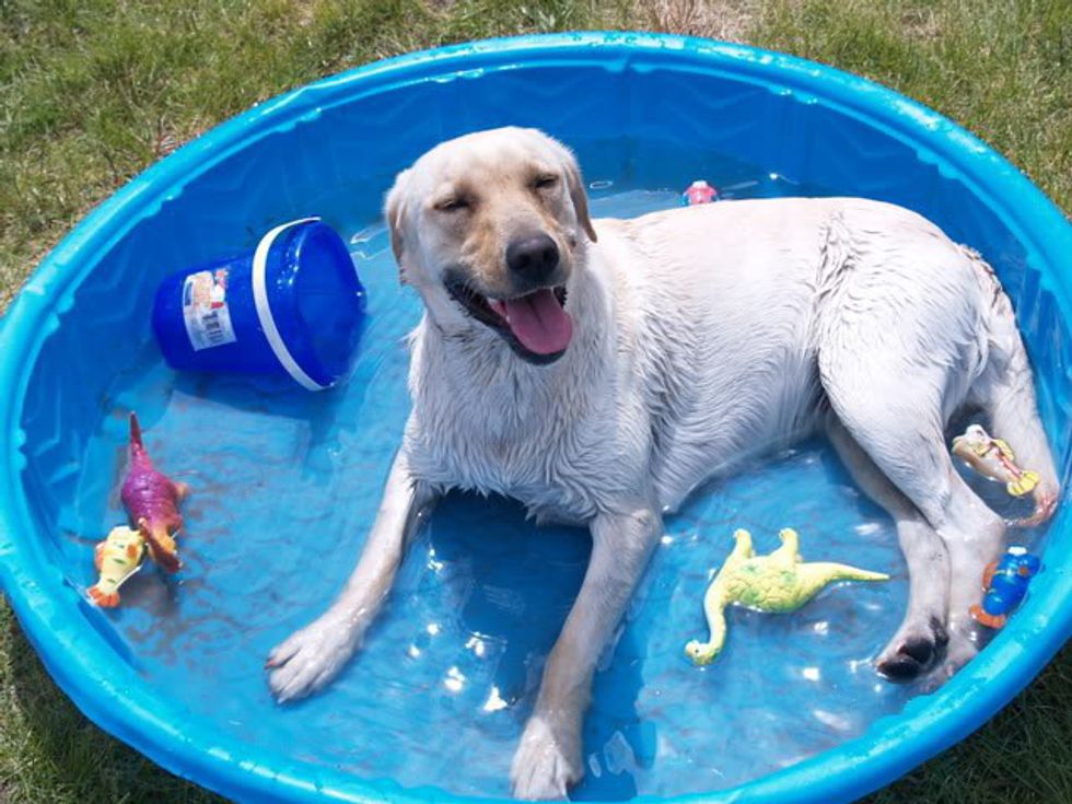 Many dog breeds love to swim, such as retrievers and setters. It's important to keep your dog supervised at all times in case it needs help or begins to stray too far away. A safe water activity to set up in your own background is fill a wading pool with water. This is great for smaller breeds or for dogs who don't know how to swim. Just beware of the splash-zone.