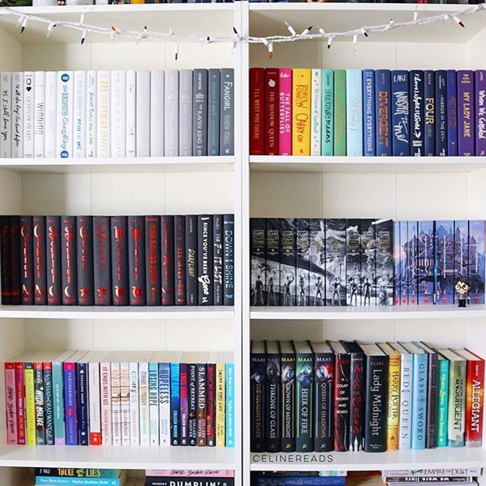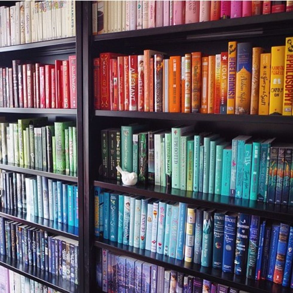 A fun way to arrange your shelves is the 'Rainbow.' If you choose this way of organizing, your books will be displayed by color. White goes with white, red goes with red, blue goes with blue and so forth. It's a fun way, but it does take some time to do it since you'll have to sort out your books first. You'll probably have doubts about the white/blue books and if they go with the blue books or the white books, but in the end, it's worth it. A side note though: do not choose this bookcase if you want your series together and your heights the same. This will not be the case and you should just try another way.