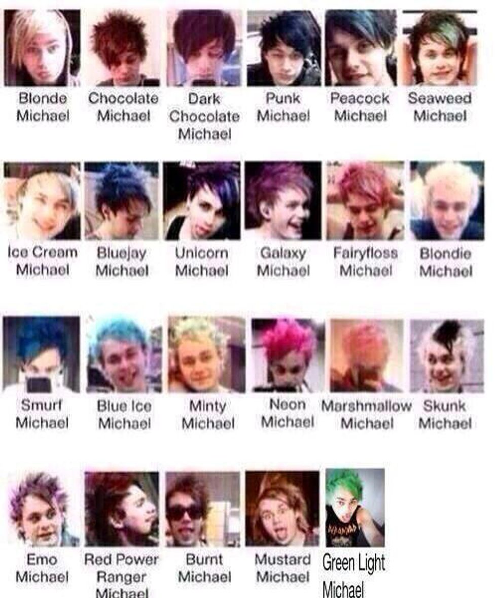 Michael Clifford, also known as Mikey, has had more hair colors in my time as a 5 Seconds of Summer fan than I can count. His hair has been black, blonde, green, red, galaxy, blue, reverse skunk (blonde with a black streak,) a mermaid blend that had blues and teals and greens, it's been lilac and so many more. Michael and his ever-changing hair should stay bright and young and happy.