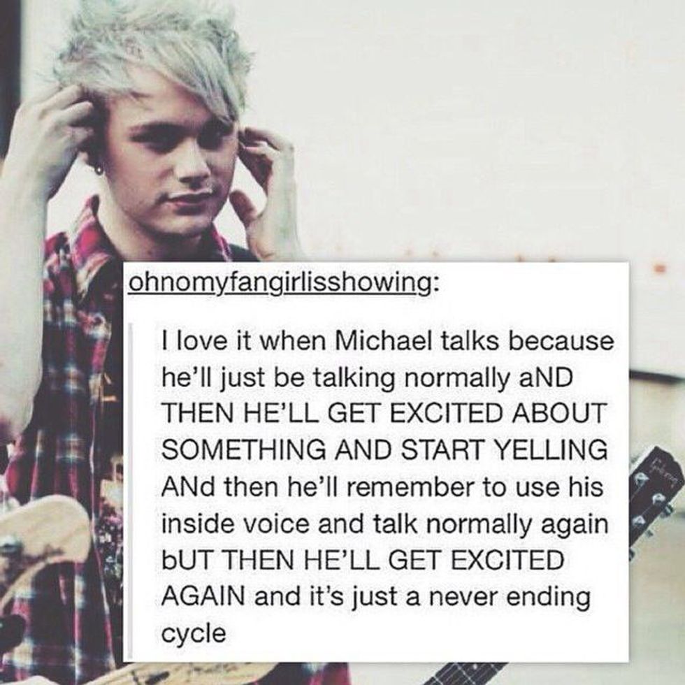 Mikey has talent, good hair, lovely eyes, pouty lips, a banging voice and sick guitar skills. One thing Michael Clifford does not have is a filter. He gets kind of loud, and curses a lot, and sometimes forgets to use his inside voice but that's okay!!! He's Mikey and he deserves to be happy and be excited.