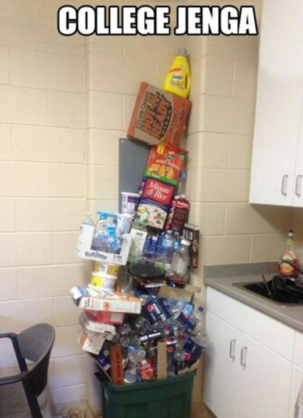 Something that always impressed me when walking through my residence hall on the weekends was how high the trash could be piled up. It's like a version of Tetris or Jenga, where the college students always win the gold, and unfortunately the janitor loses at six o'clock Monday morning.