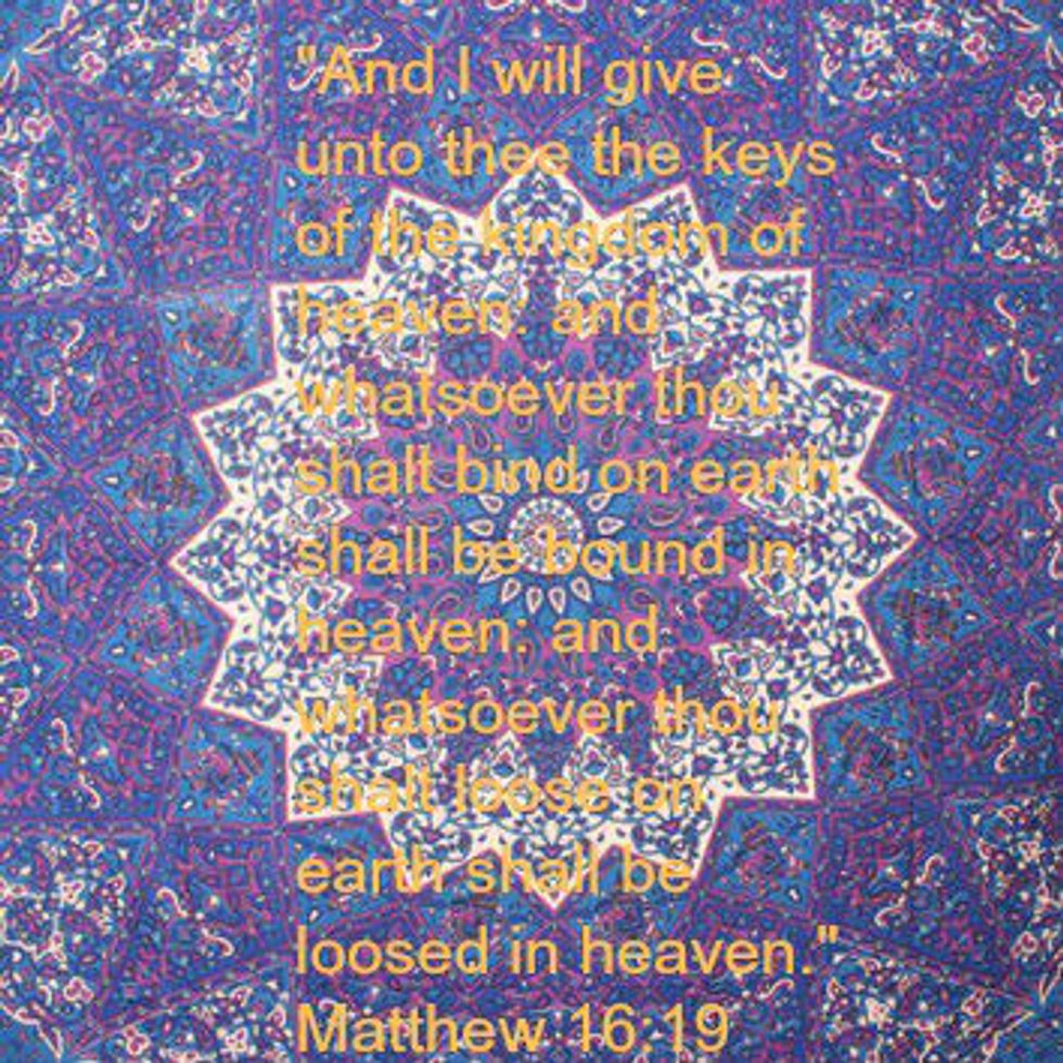 Got a large blank wall space that is just begging for a tapestry? Say no more. Hanging up a colorful tapestry that reads "And I will give unto thee the keys of the kingdom of heaven: and whatsoever thou shalt bind on earth shall be bound in heaven: and whatsoever thou shalt loose on earth shall be loosed in heaven" will add just the right amount of color to your room while also reminding you that some of the worst demons are born inside us.