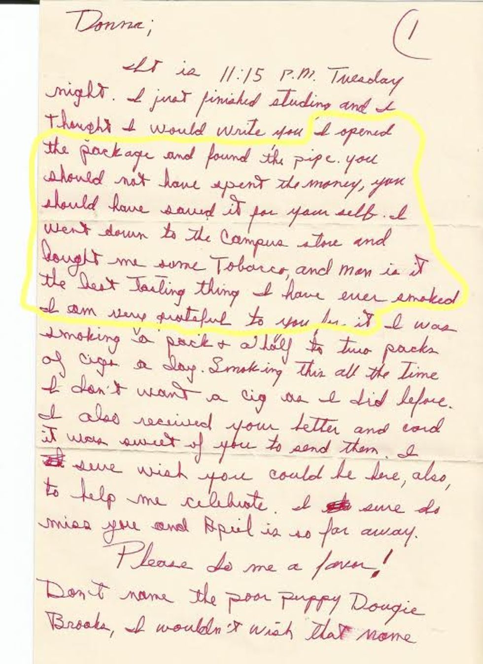 "I opened the package and found the pipe you should not have spent the money, you should have saved it for yourself. I went down to the campus store and bought me some tobacco, and man is it the best tasting thing I have ever smoked I am very grateful to you for it."