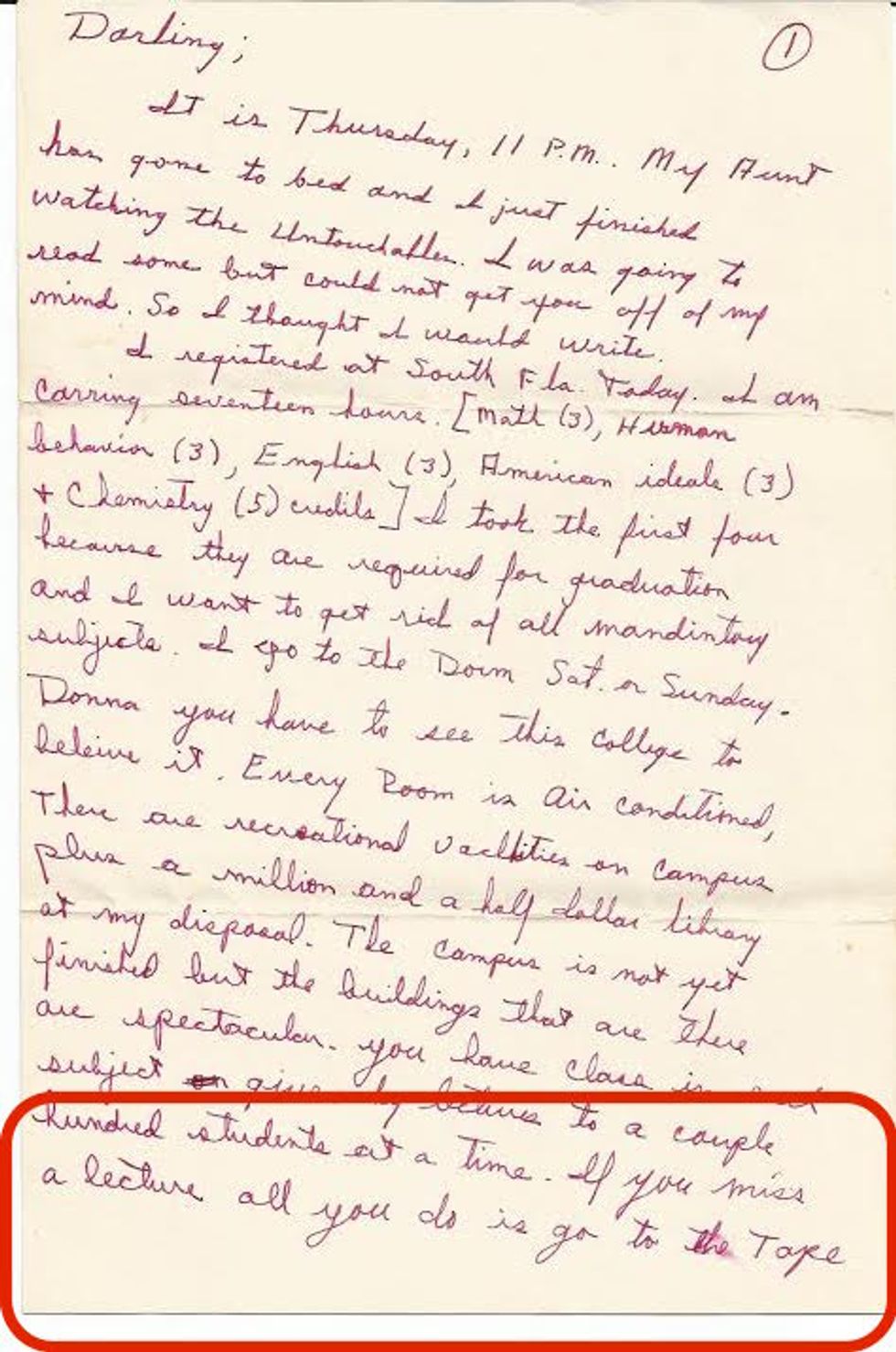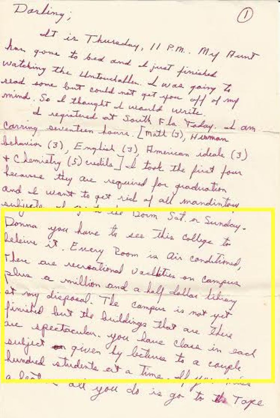"Donna you have to see this college to believe it. Every Room is Air Conditioned, there are recreational facilities on campus plus a million and a half dollar library at my disposal. The campus is not yet finished but the buildings that are there are spectacular. You have class in each subject given by lectures to a couple hundred student at the time"