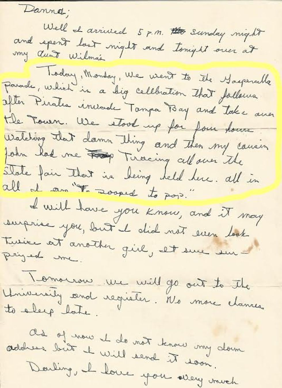 "Today, Monday, we went to the Gasparilla parade, which is a big celebration that follows after pirates invade Tampa Bay and take over the town. We stood up for four hours watching the damn thing and then my cousin John had me tracing all over the state fair that is being held here. all in all I am to pooped to pop."