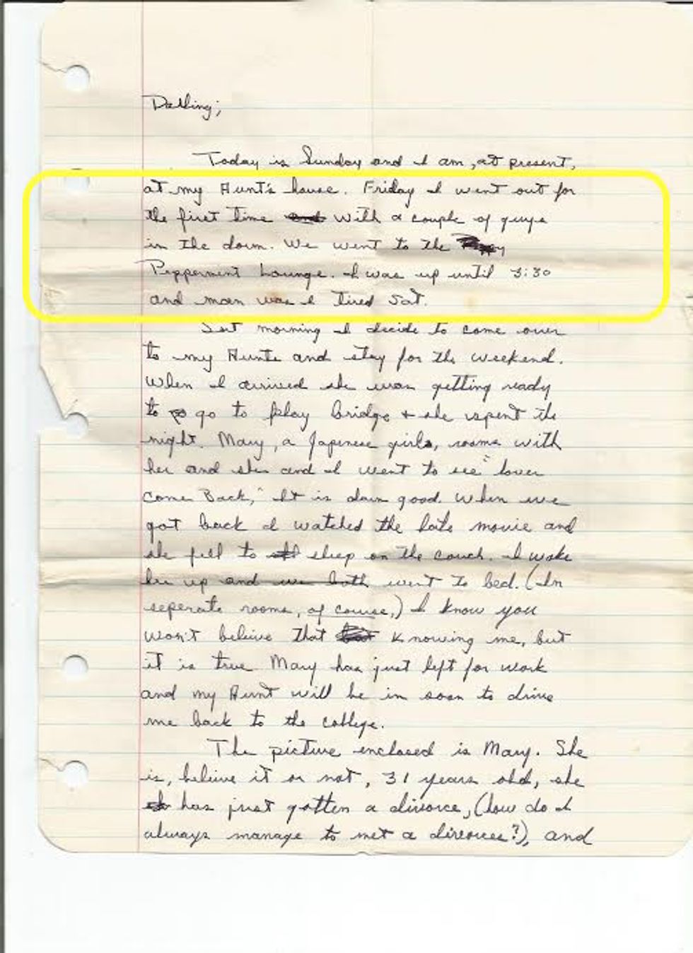 "Friday I went out for the first time with a couple of guys in the dorm. We went to the Peppermint Lounge, I was up until 3:30 and man was I tired sat."