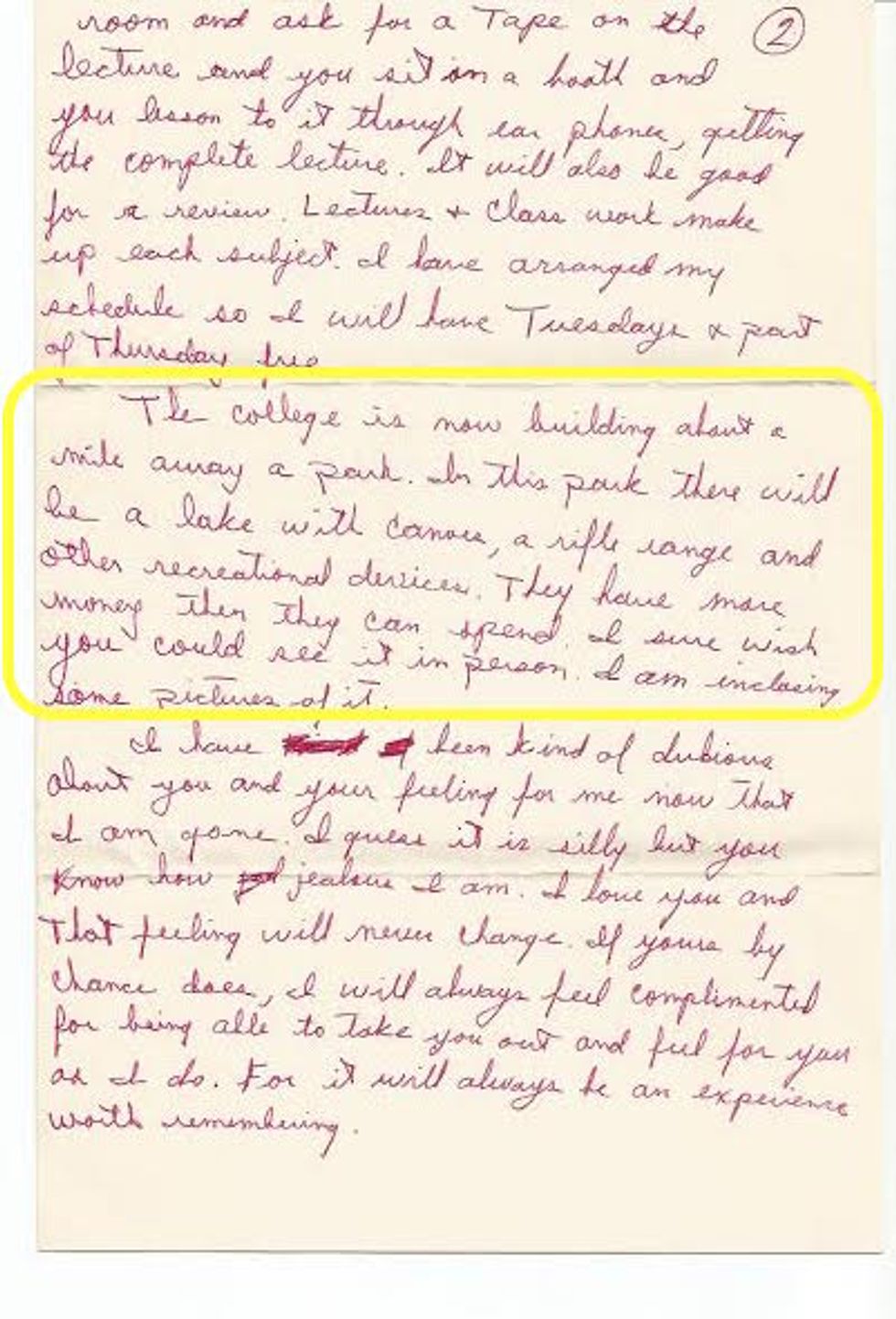 "The College is now building about a mile away from a park. In this park, there will be a lake with canoes, a rifle range, and other recreational devices. They have more money than they can spend. I sure wish you could see it in person, I am enclosing some pictures of it."
