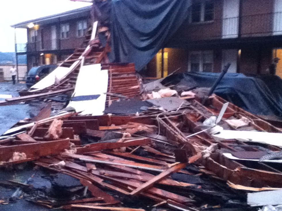 Perhaps the most well known damage in the community is with Nathan's Walk. This is an apartment complex located behind the courthouse on King Street. All residents were told that they could no longer stay in the unit. Many cars are still under roof debris, among other personal belongings.