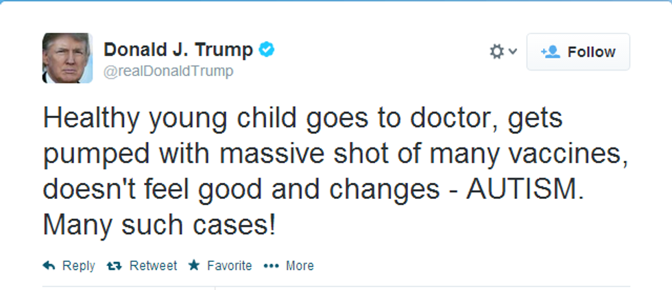 Do your research, Mr. Trump. Vaccines do not cause autism. And if you were enough of an intellect to read some research articles on the matter, you would know that this paper was denounced. #idiot