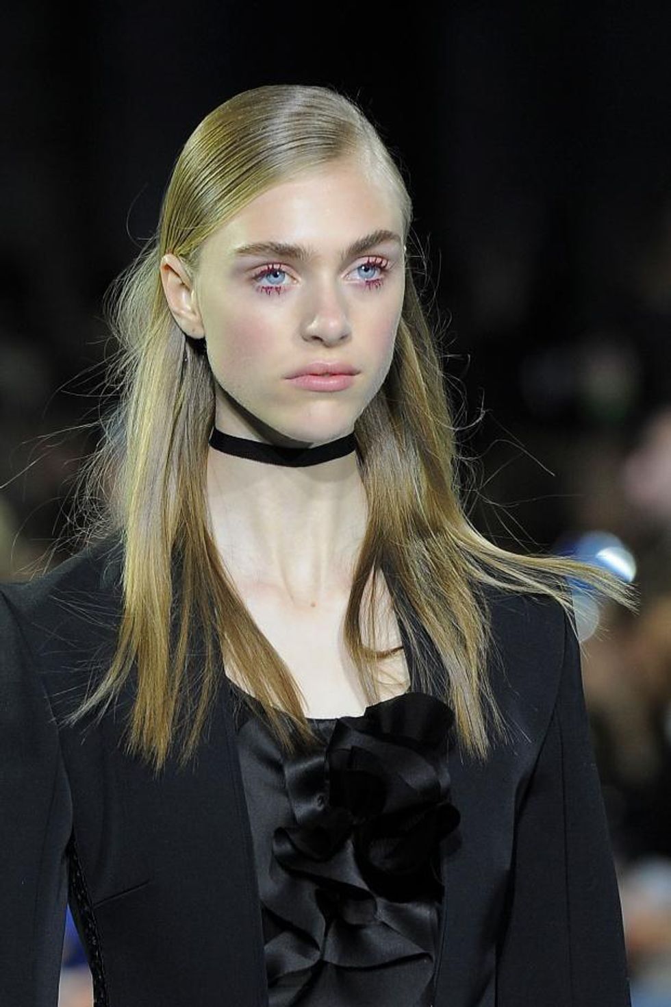 Chokers were widely represented on the runways this year. With all of the interpretations spotted (gold plated, black ribbons, patterned, beaded, ect) there is a choker look for everyone this year. This picture was take at the Mary Kantrantzou London Fashion Week Show. Chokers were seen among the hottest runways such as Dior and Valentino.