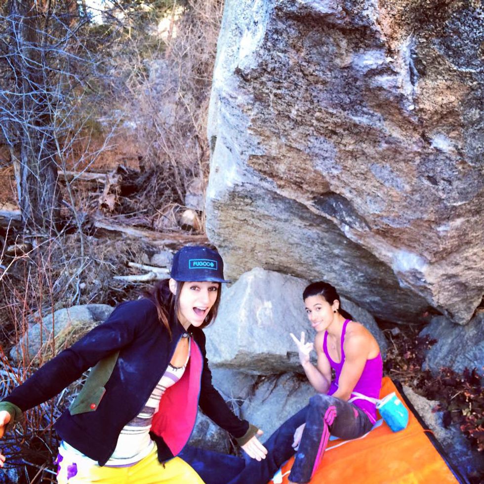 Although she trains very hard, Alex also makes sure to have fun. Climbing is growing as a sport, and competition climbing is becoming more and more popular but the climbing community is still very close. There is always a good ambiance in the climbing gym, which is one of the many reasons why people tend to get hooked on this sport. Climbing is a very friendly sport, we all cheer each other on, regardless of how good we are. Although there is a lot of pressure on Alex at the competitions, she is always laughing and smiling with other competitors. She loves competing and training but also makes sure to get outside a lot. To quote Alex "my passion for rocks and comps is 50/50" When climbing outside there is not a lot of pressure, and you can take as much time as you want. Here is a picture of Alex and her best friend Nina Williams just goofing around outdoors in Bishop.