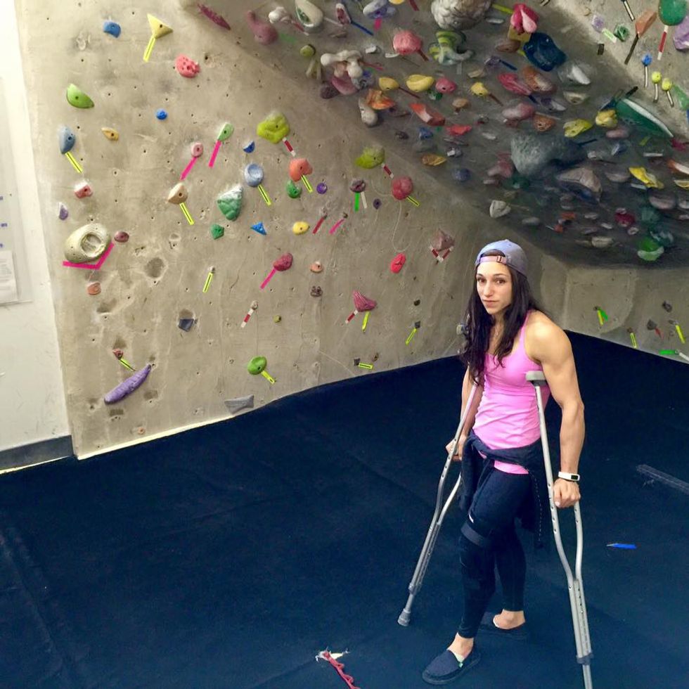 While Alex was warming up for qualifiers at the Vail world cup earlier this year, she fell 4feet off the ground on a dynamic movement and tore her ACL, MCL and meniscus. Here she is at the scene of the fall, the day afterwards.