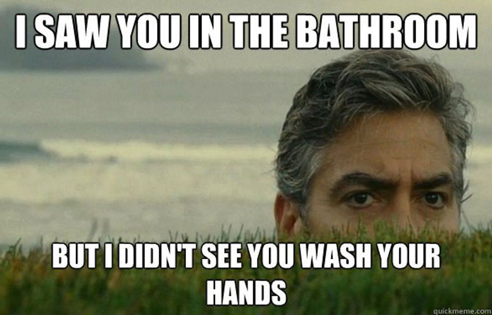Restrooms have germs. Period. It doesn't matter if it's a public bathroom or your own; they all have the same amount of germs and when you don't wash your hands you can transfer them to the people around you and potentially get them sick. Imagine going into a public restroom that looks kind of sketchy and unsanitary. Now envision yourself walking out of the stall you were just in and right out the door without washing your hands. Just think of the amount of people who have had "the runs" or the stomach flu in that same stall you were just in and now that you didn't wash your hands you have the potential of giving yourself or someone else pink eye or even the flu. So please people wash your hands no matter which number you had or which location you went to because all restrooms are dirty.