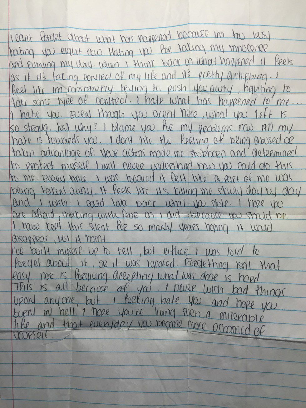 I remember writing a letter to my abusers. It was just an “if I could say anything to them what would I say,” letter. That letter I still have today. That letter explained my feelings and how much anger and hate I had towards them. It expressed my harsh feelings about the situation towards them. I wished their death. I wished they could feel the pain they caused me.