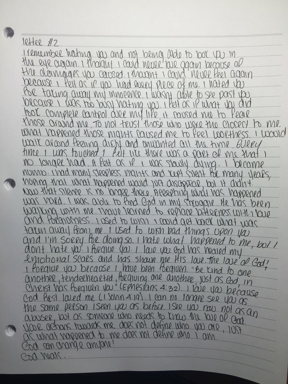 I wrote a letter to my abusers. It was just an “if I could say anything to them what would I say,” letter. The letter I still have. The letter explains everything the one before explained, except this time with love and forgiveness. Except this time, it's with God and his love.
