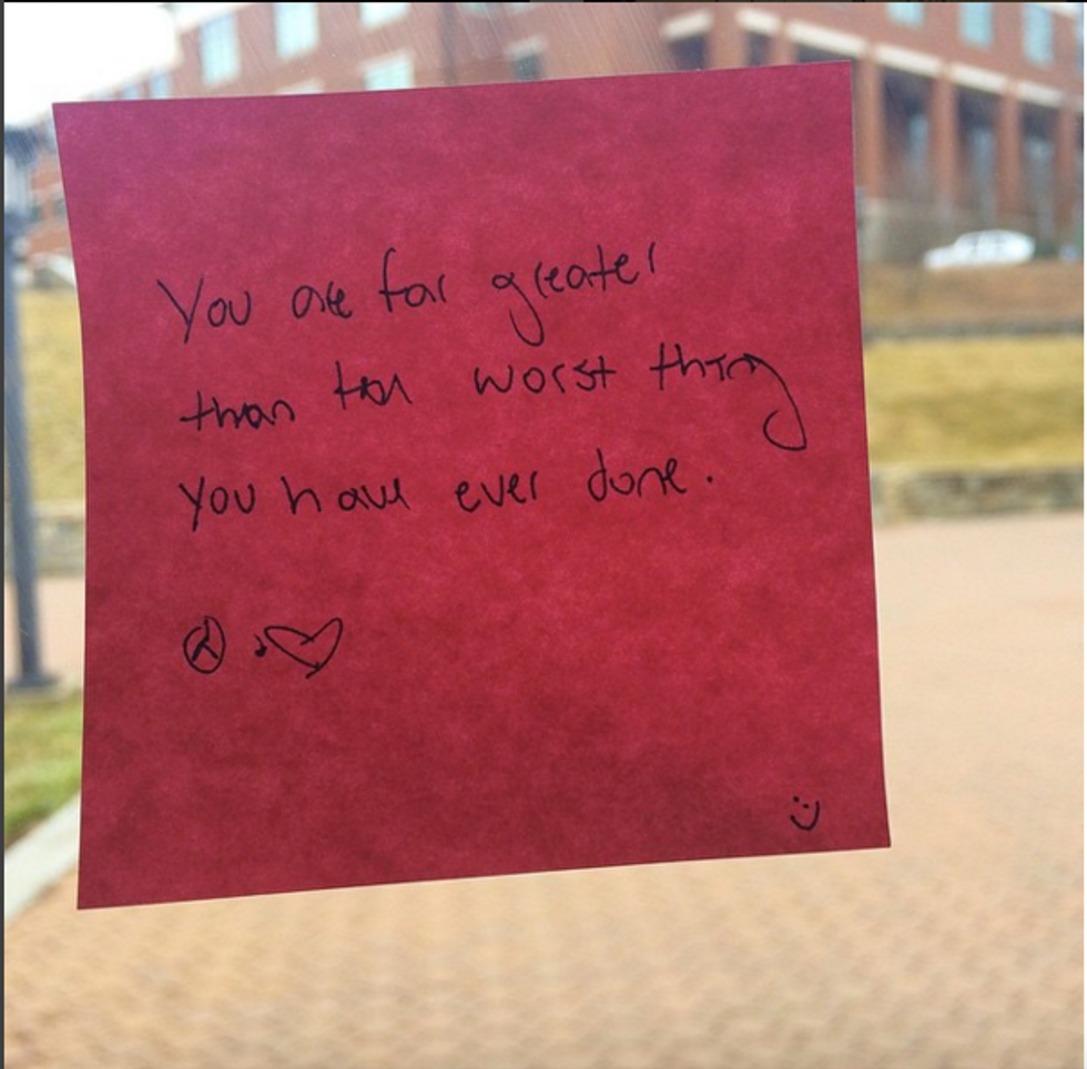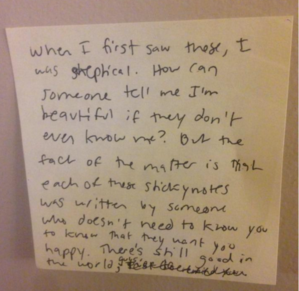 So there you have it, an awesome story and mind behind an awesome event, that has truly made a difference on our campus. To join in on this positive movement, just buy yourself some post-it notes and decorate our campus with your own positivity. You never know who's heart you can touch with your words of encouragement and love.