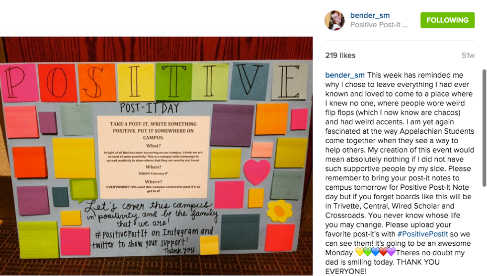 You all most likely remember the day last year, when our beautiful Appalachian State Campus became even more lovely - it was the day where our campus was adorned with colorful and positive post it notes, every which way you looked. Maybe you participated with your own positivity, or maybe you stumbled upon a sticky note that really resonated with you. However you interacted with these post-its, I'm sure you felt a sense of unity, happiness, and of course positivity among your peers - but did you ever wonder what the story behind this awesome idea was?