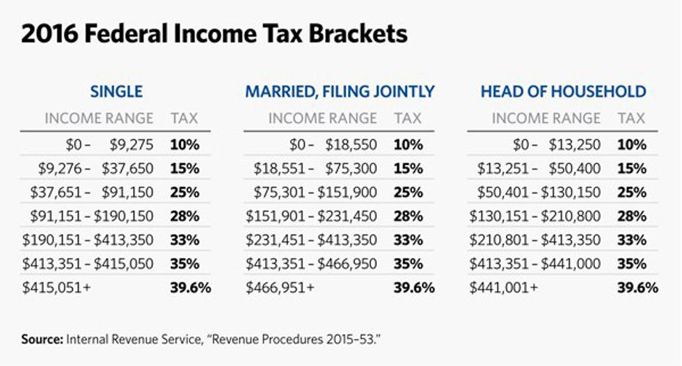The chart to the right shows the Federal Income Tax Brackets for 2016, according to the Internal Revenue Serv