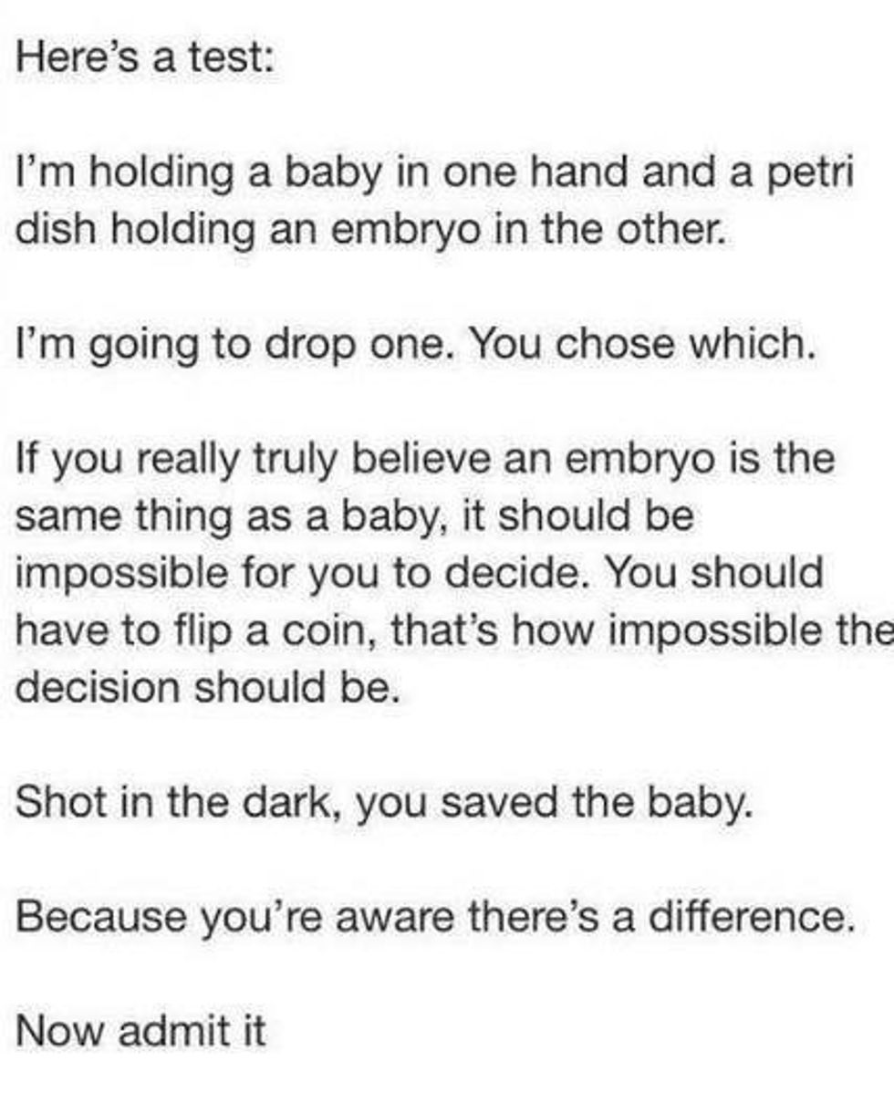 I’ve seen this meme float around quite a bit. I don’t think it’s challenging to the pro-life position, but it’s popularity has earned a response;