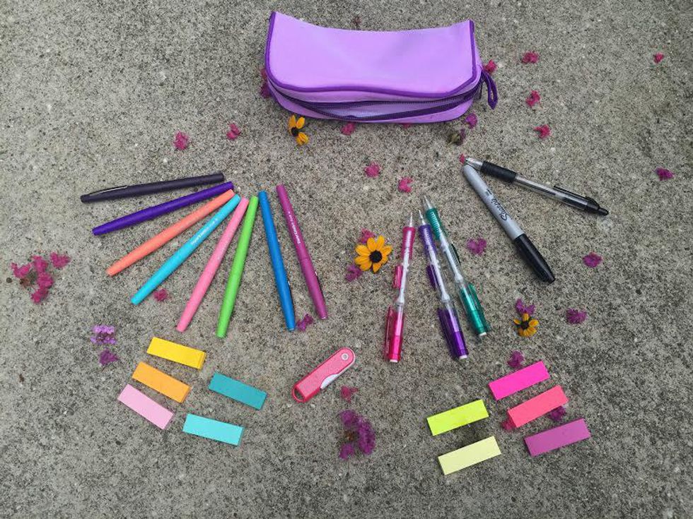 Finally, you will need supplies to fill your pencil pouch. I love using colorful pens for note taking, because not only does it look pretty, but it helps your mind lock in the information you're writing down if you can see the words stand out. I found some felt tip pens that are extremely easy to use. You will also need pencils. College students are widely known to lose pencils or borrow pencils and never give them back. If you know you can't keep up with your pencils I recommend getting a large pack of cheap pencils, so that you never run out. I, however, am very stingy when it comes to my pencils. I don't share them or lend them out (I know, what a mean classmate). I only bought three pencils, and my goal is to keep all three. You will also need a couple black or blue pens, maybe a Sharpie, and a flashdrive. I also recommend a three-hole punch and a stapler, because college professors rarely have their own. One last thing I have found to be helpful are PostIts. Often times you are not allowed to write in your college books unless you buy them instead of renting (which on a college student budget, you probably won't do). Sliding in PostIts here and there is a great way to keep track of important passages and jot down notes in your textbooks. Again, I found all of these items at Target.