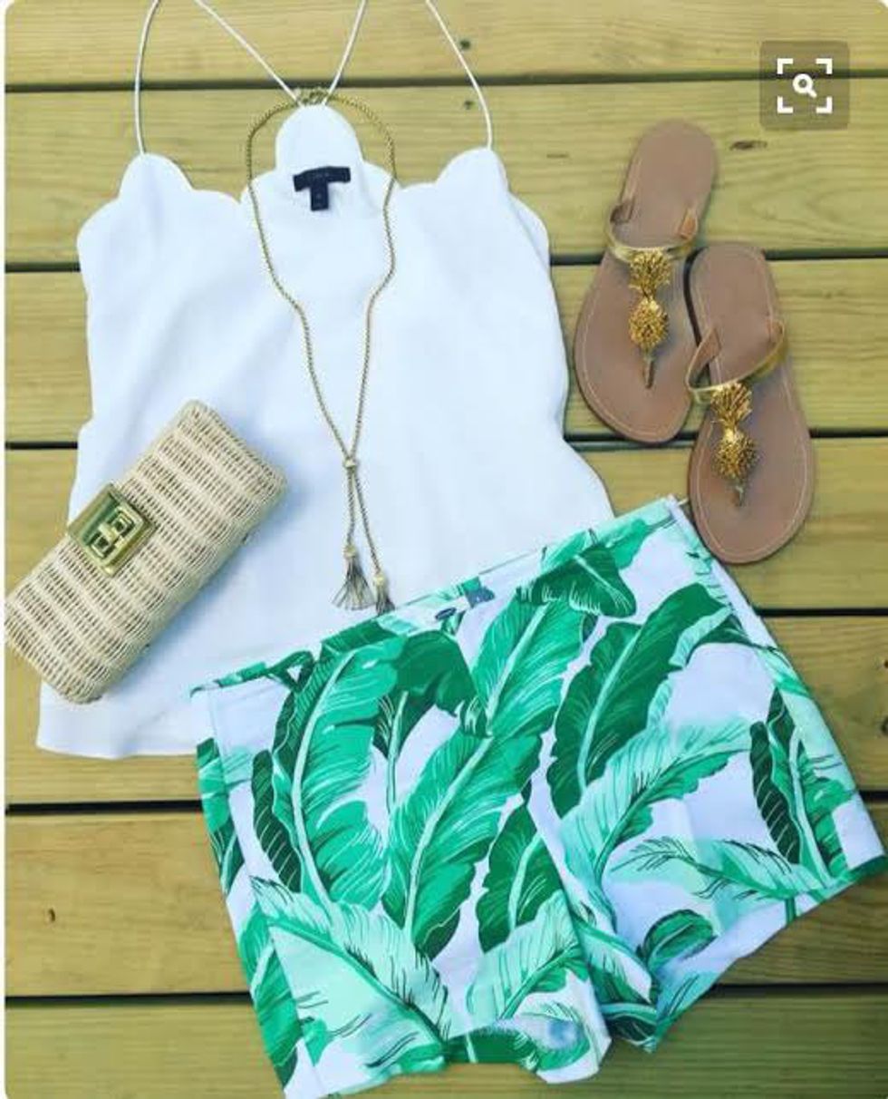 A cute pair of printed shorts, a loose tank top, and simple accessories. This outfit is very cute, and still comfortable for a long day of walking.