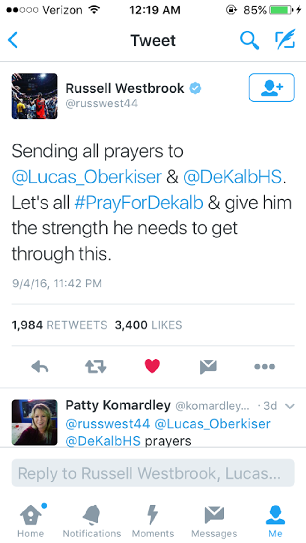 Besides DeKalb, many other high school and middle schools have been showing their support by wearing blue and green (the boys' favorite colors). They have been posting pictures of seas of green and blue with the hashtag #PrayForDeKalb. Others have been sending kind words, tweeting heartfelt messages, and even wearing #34 and #78 on their helmets during their own football games to honor the football players. Even Russell Westbrook, a professional basketball player who plays for Oklahoma City Thunder, tweeted his support for the boy who was in critical condition fighting for his life.