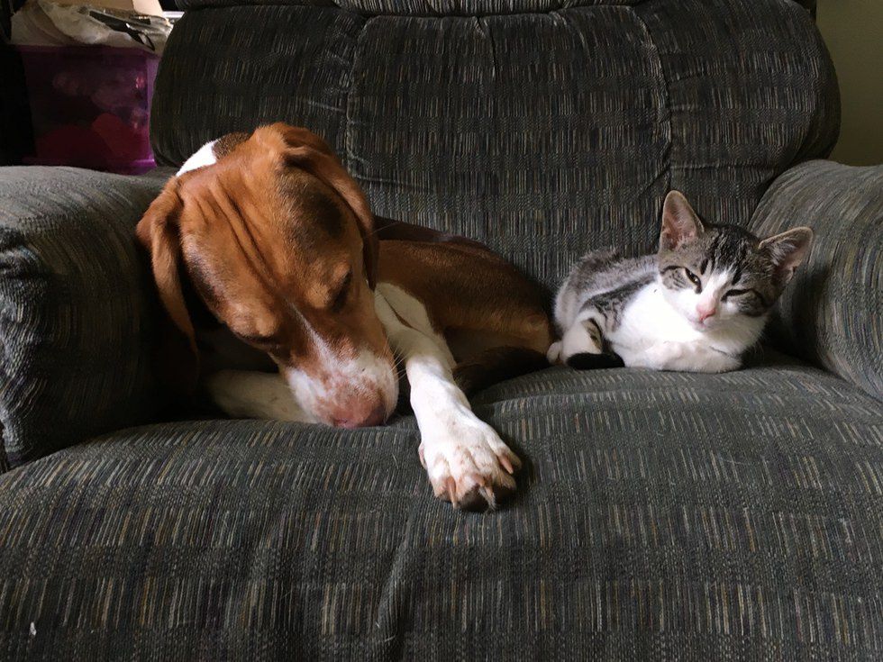 When I was growing up, my friends always asked me how my cats and dogs got along so well because of the stereotype that they were enemies. Beagles get along with almost every creature (except maybe rabbits and chipmunks), and it was never a problem bringing in a new baby to the family.