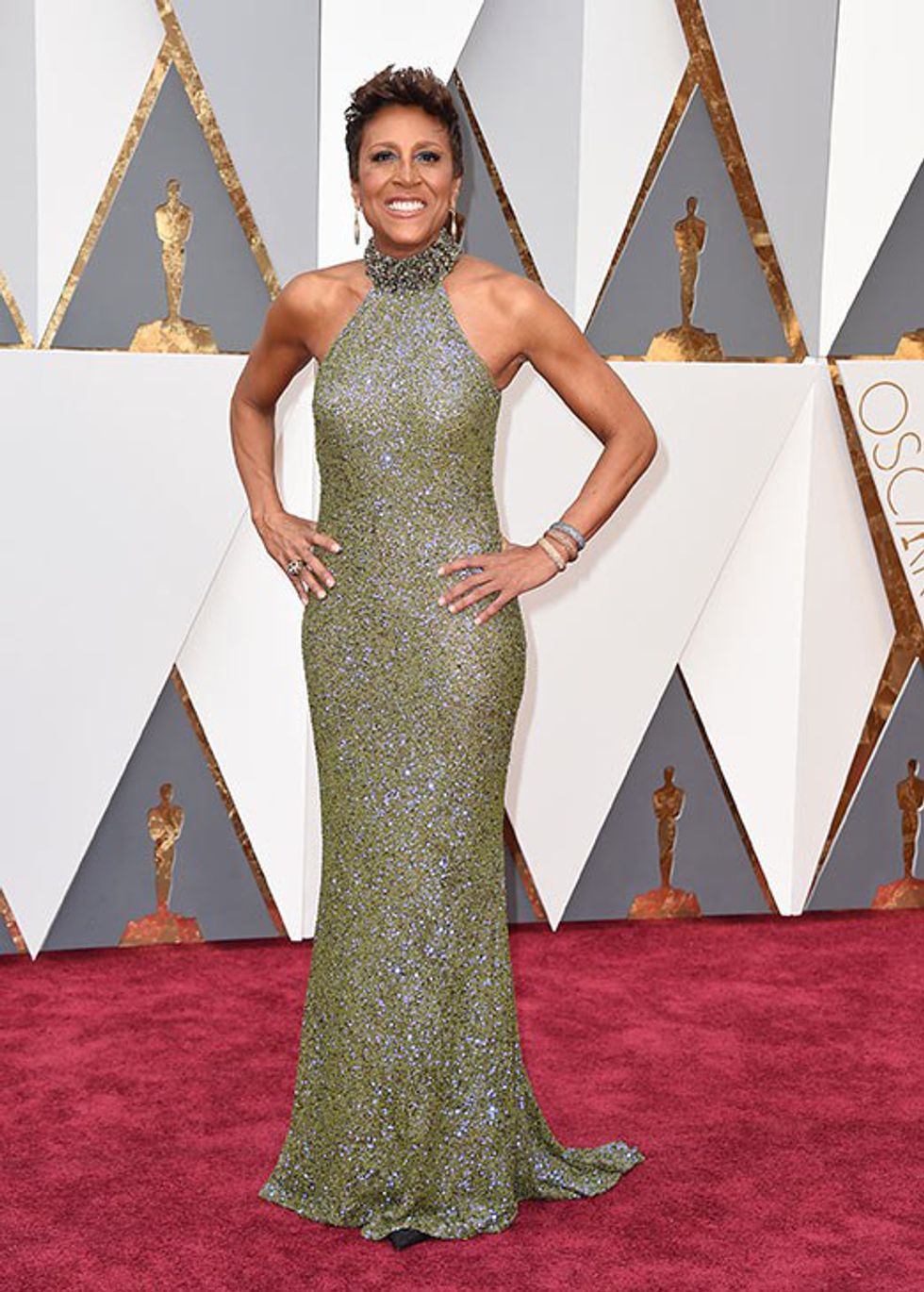 Robin Roberts is seen interviewing celebrities on the red carpet at the Oscars. She is also seen in this beautiful green halter neckline gown.