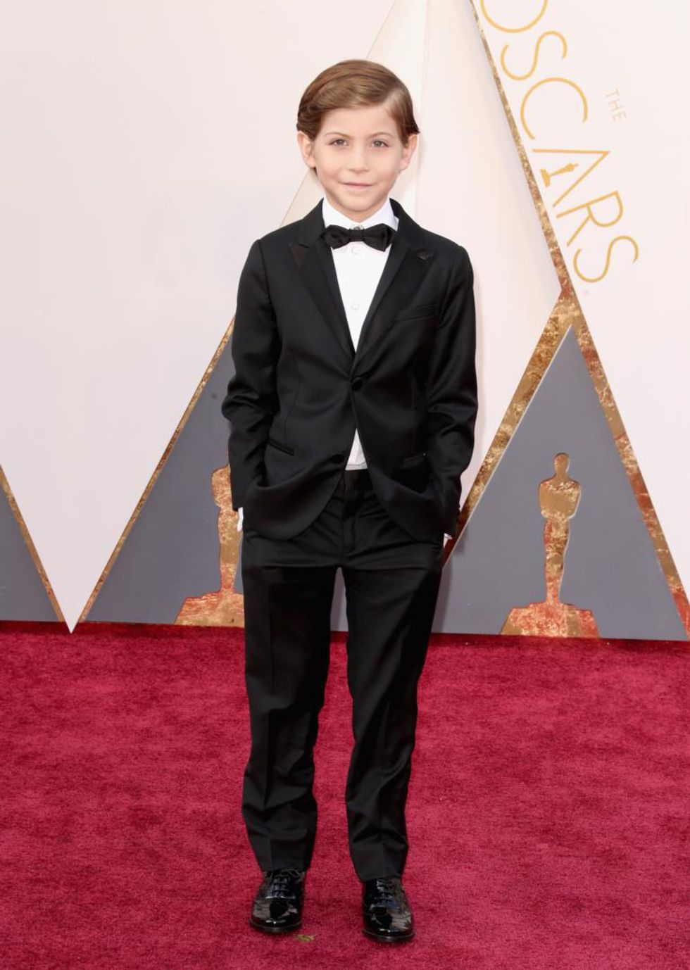 Without a doubt, my opinion on who the cutest gentleman on the red carpet is Jacob Tremblay. He is 9-years-old, sporting an adorable tuxedo, paired with 'millennium falcon' cufflinks and 'Darth Vader' socks, both from the Star Wars movie. He is presenting an award at the ceremony and starred in the Oscar-nominated movie "Room."