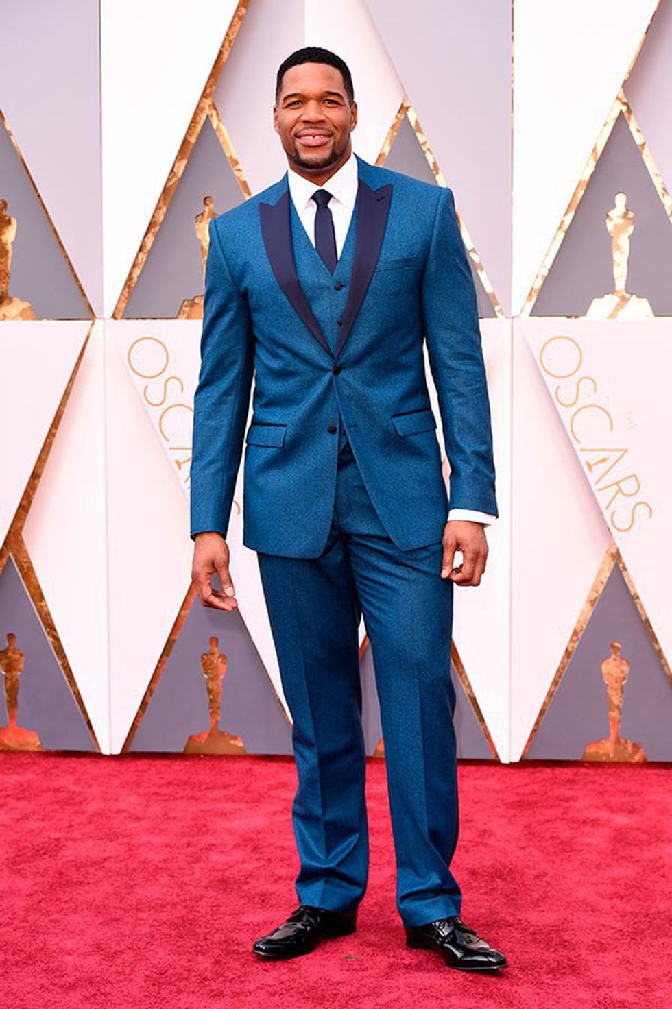 Next up, Michael Strahan. I adore his navy blue tuxedo. He looks flawless as he interviews everyone on the red carpet, along with his co-star of the hit talk show "Kelly and Michael."