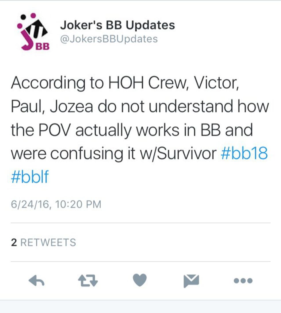 If you want to find out what goes on in the house before everyone else, follow @JokersBBUpdates on Twitter! Jokers live tweets what happens on the live feeds, so viewers can know everything that happens in the house, even if it isn't aired on the show! Tune into “Big Brother” on CBS on Wednesdays, Thursdays and Sundays. Now all that’s left is to update your rankings! Here's mine: