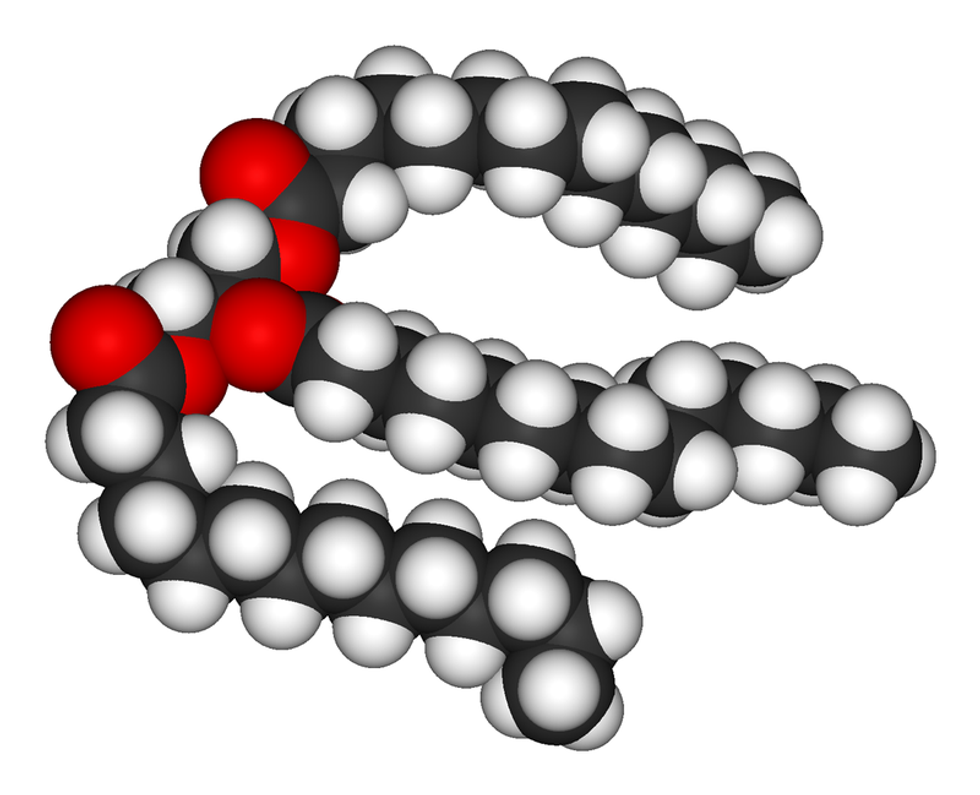 Fats, also known as triglycerides or lipids, are organic molecules primarily composed of carbon and hydrogen atoms (with just a few oxygen atoms). The following image depicts a common triglyceride structure with a glycerol backbone and three fatty acid chains branching from it.
