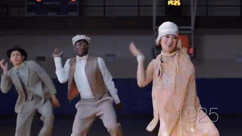 The next scene is a reference to a set of videos that have blown up with the past year, with the theme "A Century of _____". There has been one with male fashion, one with female fashion, and even one with wedding gowns. And as you can tell by the song, it is also the scene where they're openly performing the Whip and the Nae Nae.