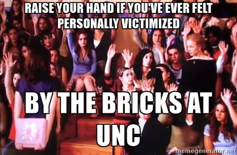 By the time one graduates from UNC, it’s likely that they will have at least one embarrassing story of student vs. brick, and nine times out of ten, the brick won. Sophomore Allie Cauley recalls an embarrassing moment from her freshman year where the bricks got the best of her. “One day, while late to class, I was quickly typing away on my phone to tell my friend to save me a seat, and tripped on a brick near Phillips Hall,” she reminisced. The incident resulted in an untimely fall in front of about 30 people and resulted in humble humility as falling/tripping over the bricks has become a sort of initiation right for freshman.