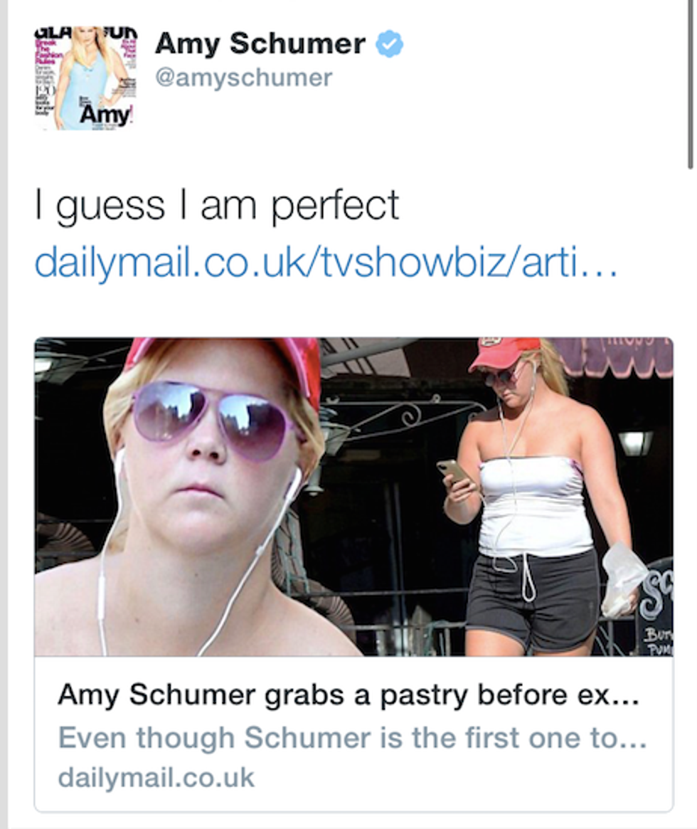 She is an icon in the media for young girls and teens. Amy does not aspire to be stick thin or be photoshopped into someone she is not. She is a real, strong woman who loves herself. She has body positivity which shows through her comedy and makes her a mogul and a voice for the needed change in society.
