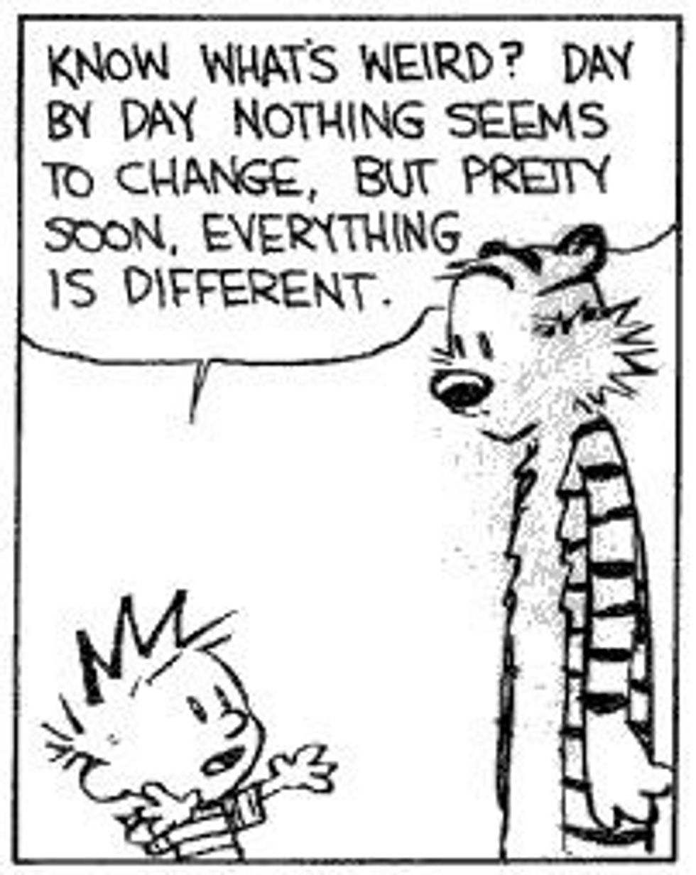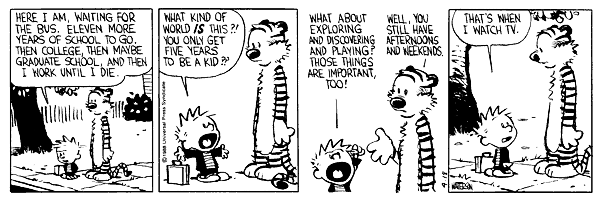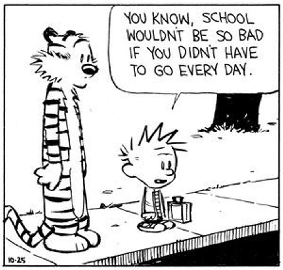 And although readers didn't get to experience this dynamic duo going off to college and facing finals, part-time jobs, and girls more aggravating than Susie Derkins, I believe Calvin still has some wisdom for the college kids of today that grew up reading about his tuna sandwiches and snowmen.