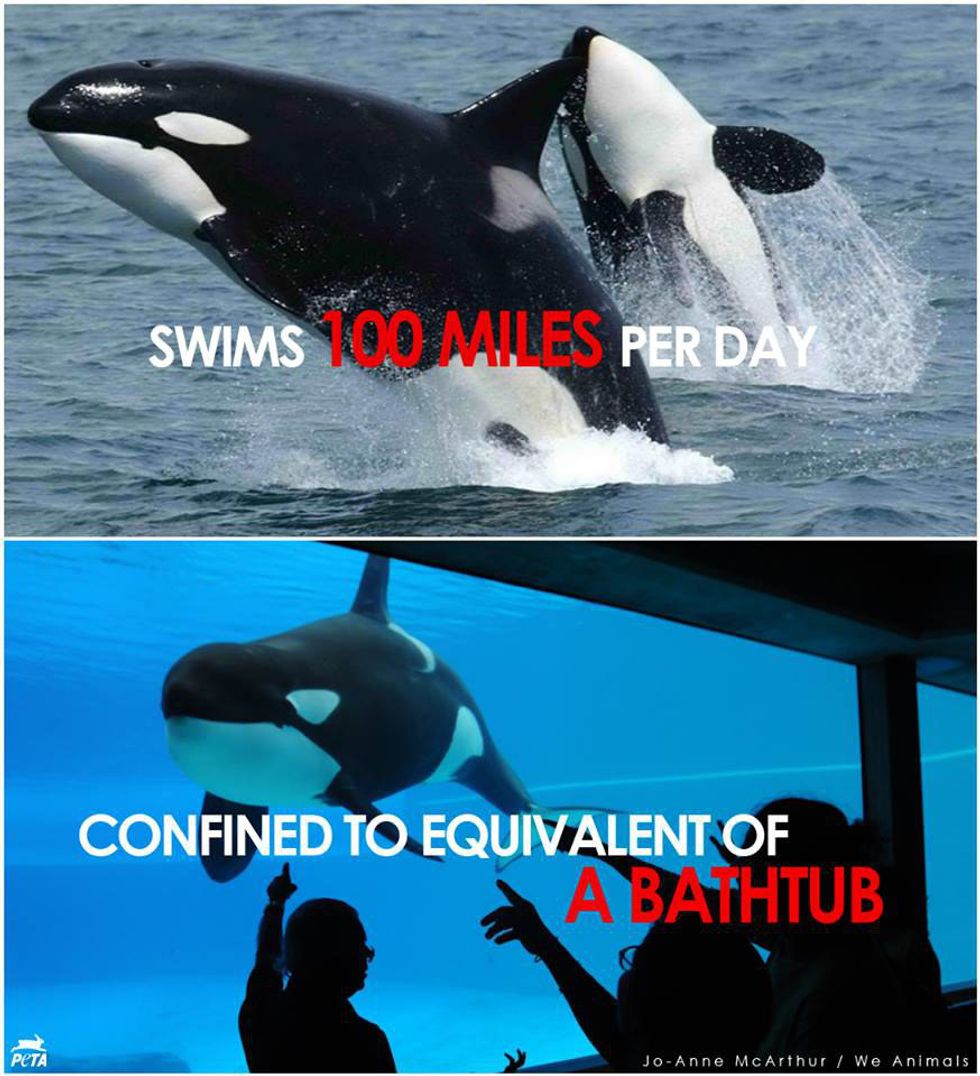 Everyday, free orcas swim around 100 miles in the ocean. At SeaWorld, the orcas swim around 1,500 laps a day which leads to psychotic, self-damaging behavior such as ramming themselves against the tanks and chewing on the sides.