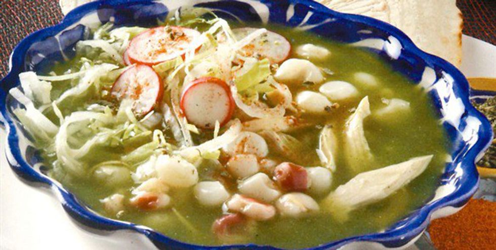 Pozolé rojo or verde with tostadas and sour cream, lime, onion, oregano, sliced radish and cabbage (some use lettuce)