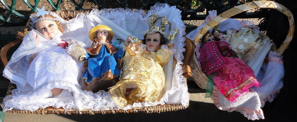 In our nativity scene, we have Jose and Maria and an Angel watching over what will be baby Jesus when we come back home from the festivities to put him to bed after rocking him to sleep. In addition, the nativity scene will include the three Kings and a donkey, a bull, and a few sheep. (Some may choose to add a lot of other things, such as other animals, or structures!) And so, everyone brings their baby Jesus along (each family's baby Jesus will vary in size and color)