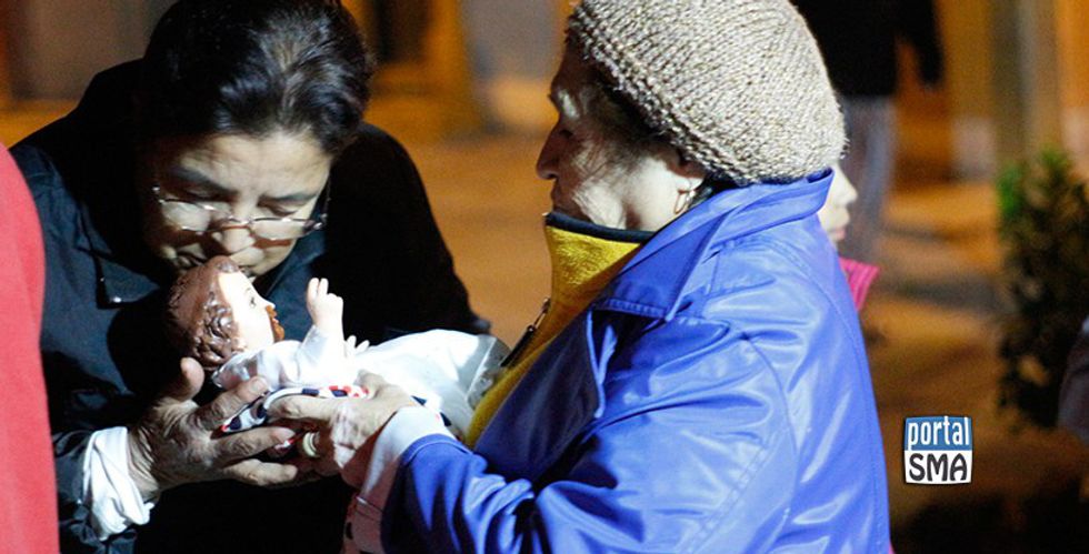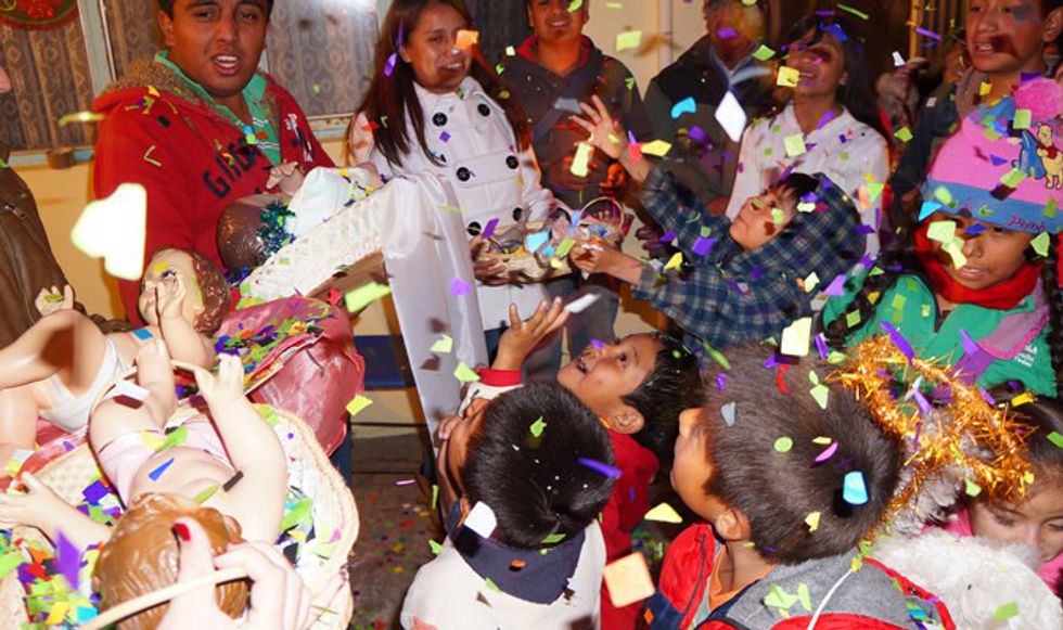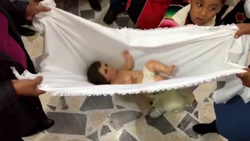 with a woven blanket to wrap him up to arrive at the house the celebration is taking place at and then when the time comes to rock baby Jesus to sleep, we place each of our baby Jesuses on the blanket and with one person at each end we rock our baby Jesus to sleep and sing a lot of specific chants. In addition, we throw confetti and have sparklers!