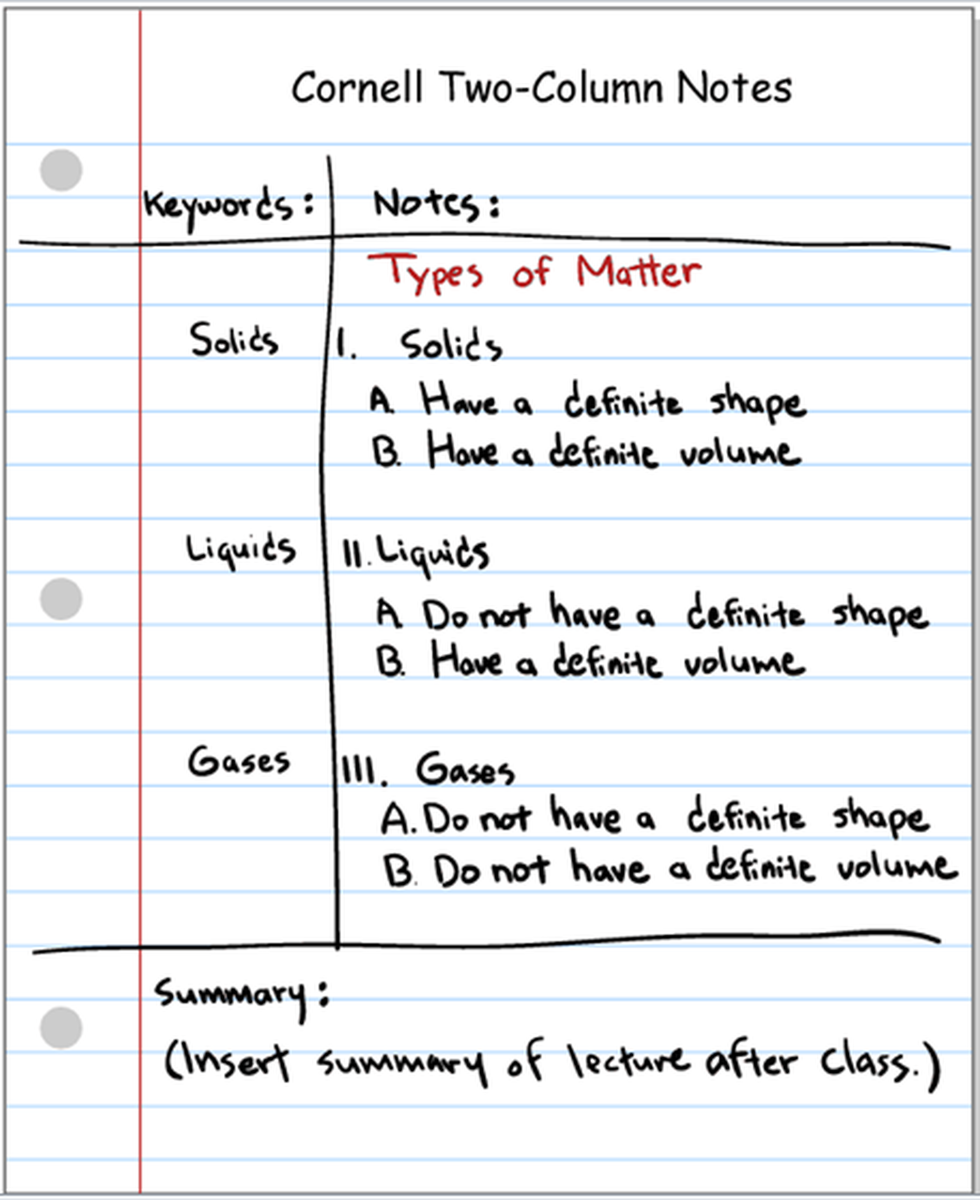 Cornell notes is a system devised in the 1950s by a professor at (no surprise) Cornell. It stems from the idea that simply writing down what is said in lecture is insufficient to learn information - that we as students must revisit our notes frequently to increase recall and retention of information. To that end, one sets up a page of Cornell notes as follows: