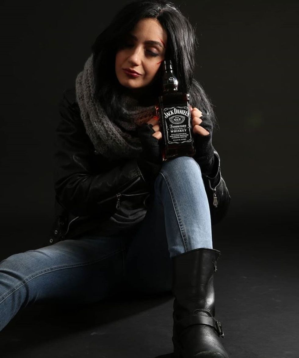 NEEDED: Black leather jacket, light jeans, grey scarf, white shirt, and a bottle of whiskey.
