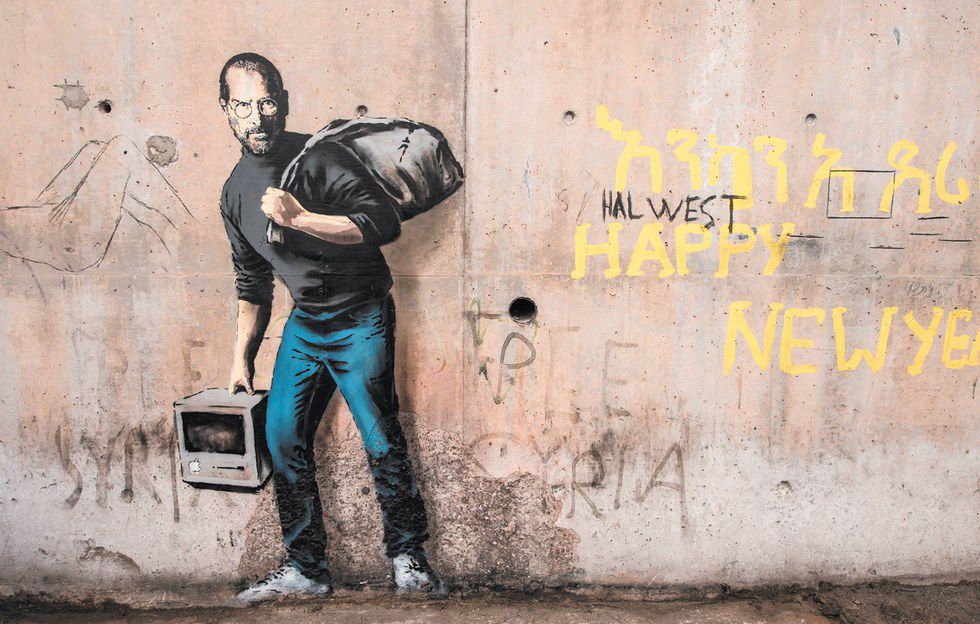 In response to many countries closing off their borders to Syrian refugees during the European Migrant Crisis, Banksy depicted a mural of Steve Jobs, the son of a Syrian migrant saying that "We're often led to believe migration is a drain on the country's resources...but Apple is the world's most profitable company, it pays over $7B a year in taxes--and it only exists because they allowed in a young man from Homs." In painting this mural, Banksy hopes to create awareness of the millions of refugees that desperately need our help.